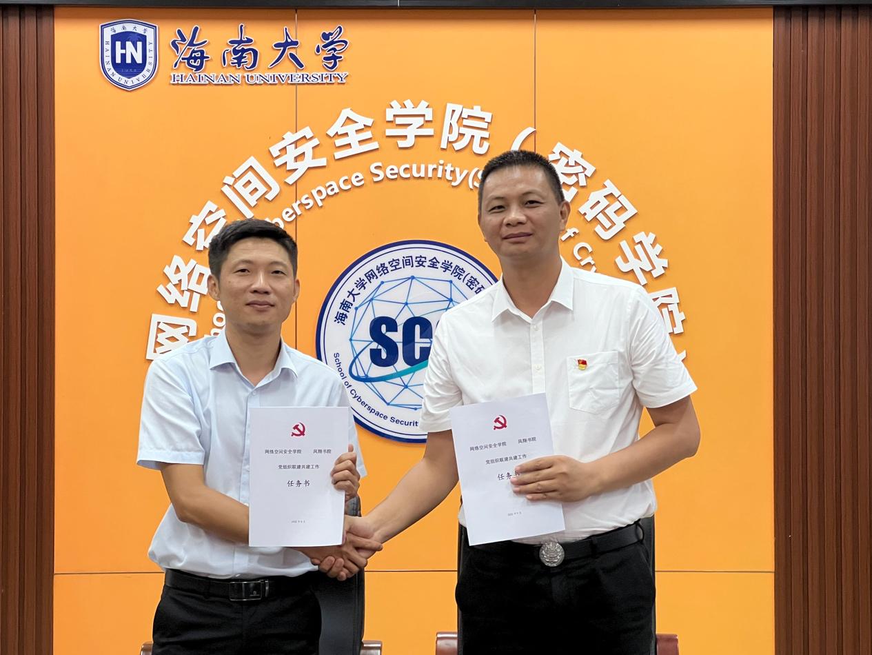 会上,凤翔书院党委副书记(主持党委工作)王华伟、网络空间安全学院(密码学院)党总支书记陈广锐分别代表书院、学院签署书院学院党组织联建共建工作任务书。