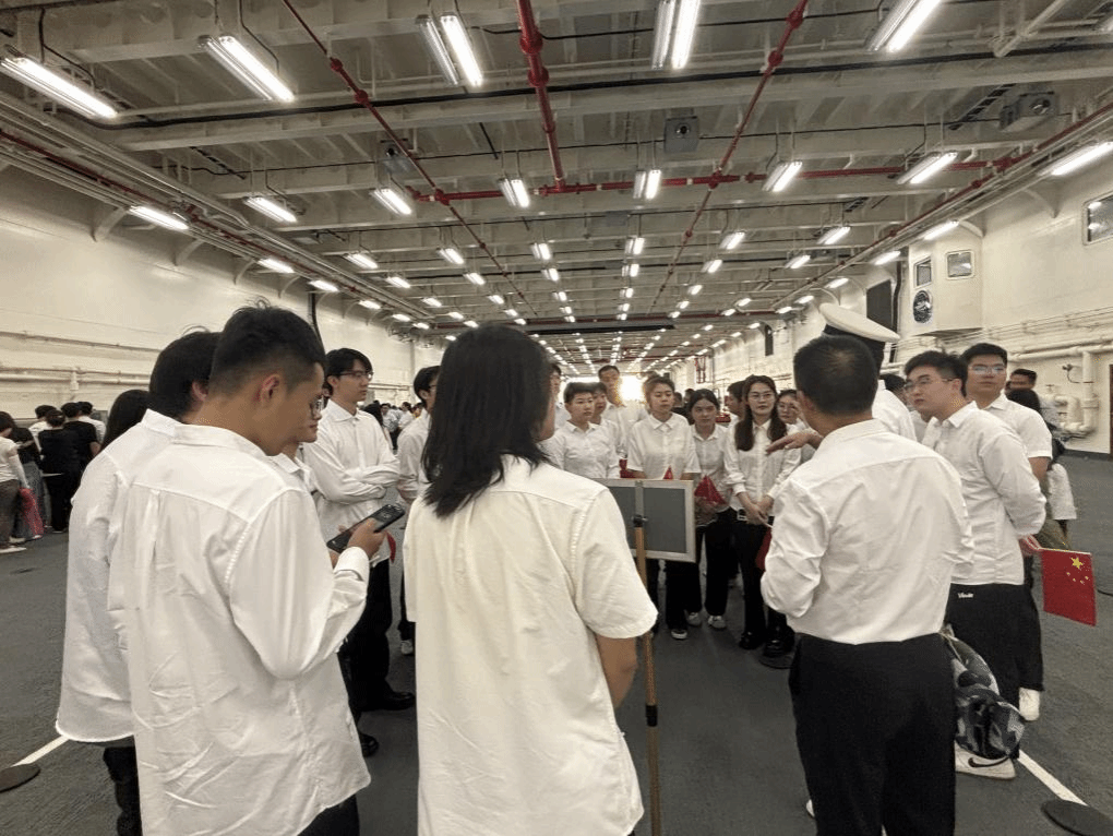 烈日炎炎,师生们手持小国旗,怀着对人民海军的崇敬之情,步伐整齐、有序登舰。师生们依次参观了海南舰各开放展区,爬旋梯、进舱室、登甲板,详细了解了海南舰的构造配置和服役经历,现代化的舰载装备令师生们感慨万千,纷纷赞叹人民海军76年来的飞速发展,激动与自豪之情溢于言表。威严挺拔的海军战士们微笑着迎接每一位参观的师生群众,耐心解答同学们的提问,与师生们合影留念,中国人民解放军同亿万人民群众的鱼水之情在此刻得以深刻诠释。