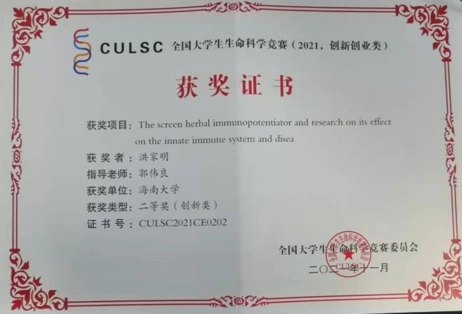 作品全称:The screen herbal immunopotentiator and research on its effect on the innate immune system and disea