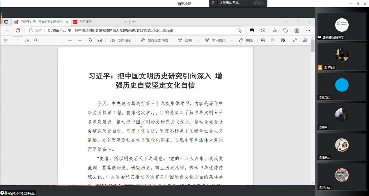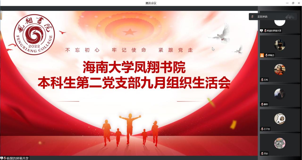 2022年9月27日晚,凤翔书院本科生第二党支部于腾讯会议线上开展九月份组织生活会,学习习近平总书记 2022 年 5 月 27 日在十九届中央政治局第三十九次集体学习时的重要讲话精神:把中国文明历史研究引向深入增强历史自觉坚定文化自信。本次会议由支部杨慧同志主持。