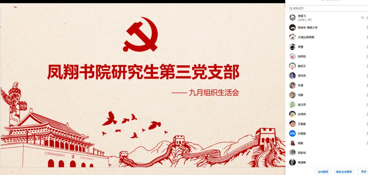 2022年9月27日15时,为进一步提高支部凝聚力,明确努力方向,yl9193永利官网凤翔书院研究生第三党支部线上开展了9月组织生活,本次会议由党员李振飞主持。本次组织生活会分别由常通、陆坤宇、李振飞三位党员同志通过领学的方式,带领大家共同学习了三个专题。