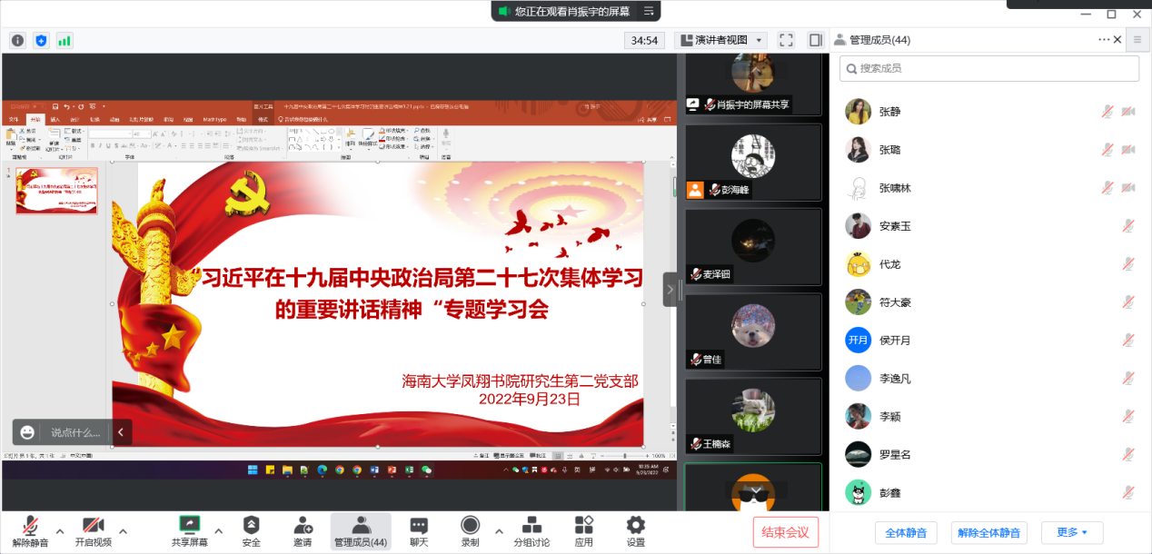 凤翔书院研究生第二党支部于2022年9月25日上午10点,线上开展了9月组织生活会,集中学习了习近平总书记 2021年1月28日在十九届中央政治局第二十七次集体学习时的重要讲话精神以及习近平总书记2017年8月1日在庆祝中国人民解放军建军 90 周年大会上的重要讲话精神。支部书记邵雨老师,副书记樊雪峰同志,支部全体党员及积极分子于会,肖振宇同志主持会议。